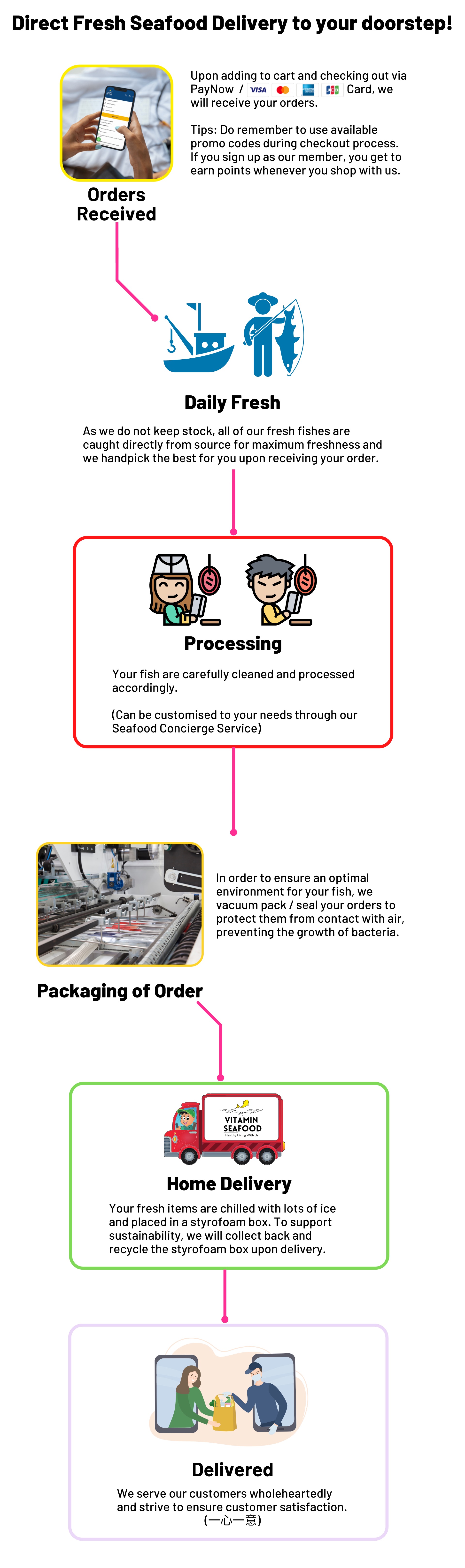 Fresh seafood prices are subject to changes and we will request for top-ups to be made on the delivery day itself.